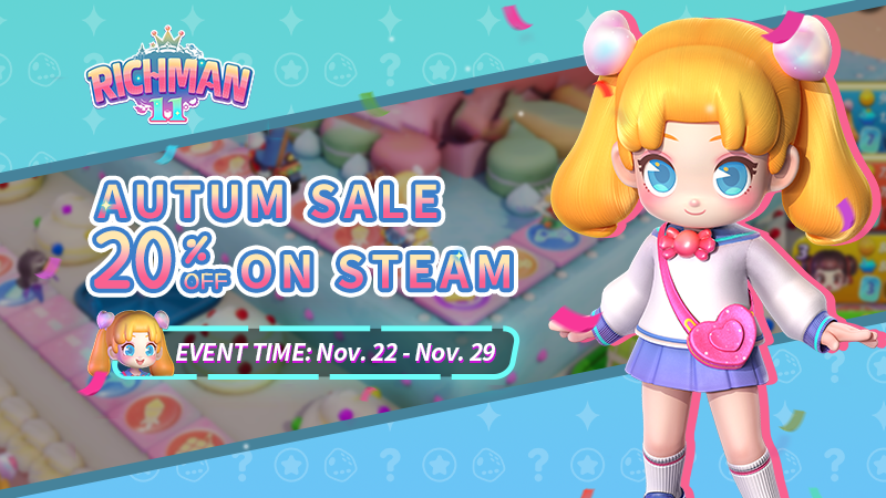 Autum Sale begins!, Richman 11 now has 20% off discount. Play with your friends, you can select maps, characters and group play, creating free play or challenge play. Try to earn money and win the play by investing properties!