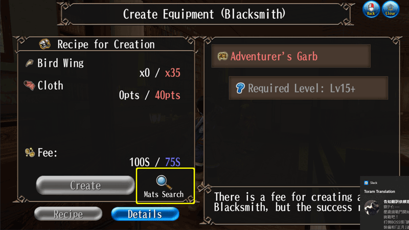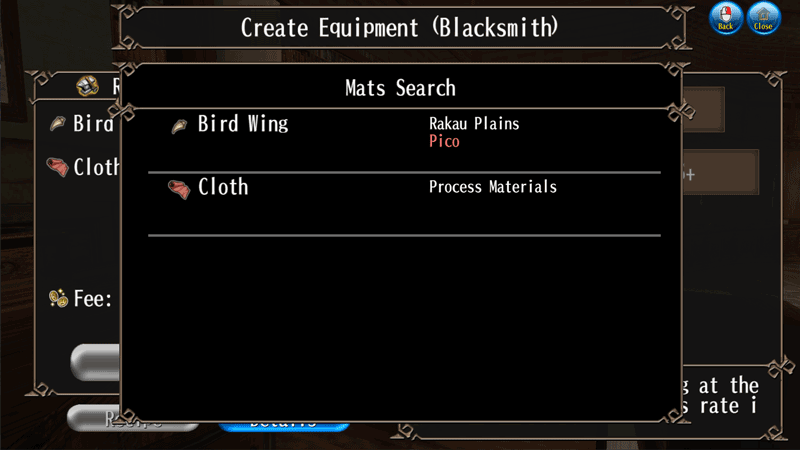 Use "Mats Search" to check the materials required in a crafting recipe.