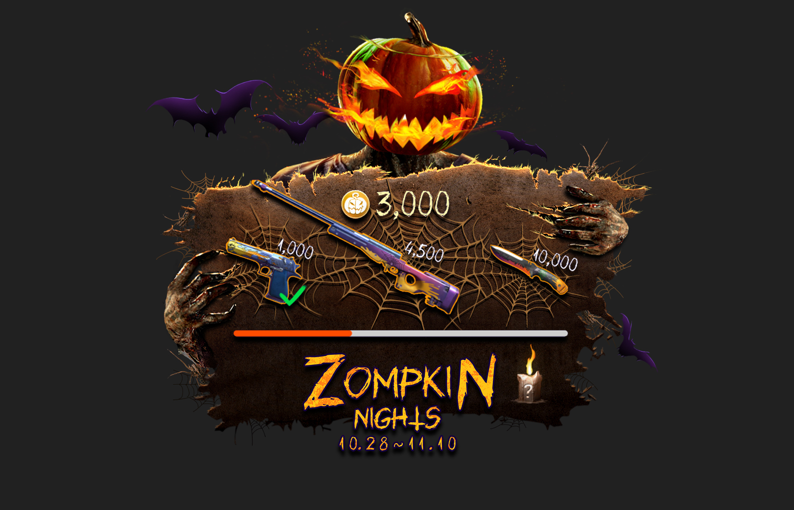 This update combines two long-requested features from our community. Players are now able to acquire 3 unique weapon skins by challenging the Zompkin Night event! Explore Halloween-themed HQ, hop in the game, and pop some pumpkin heads!
