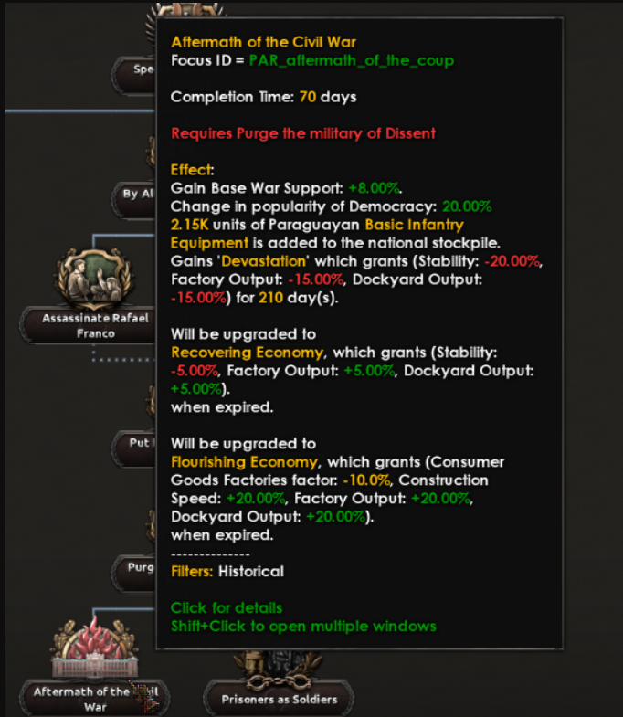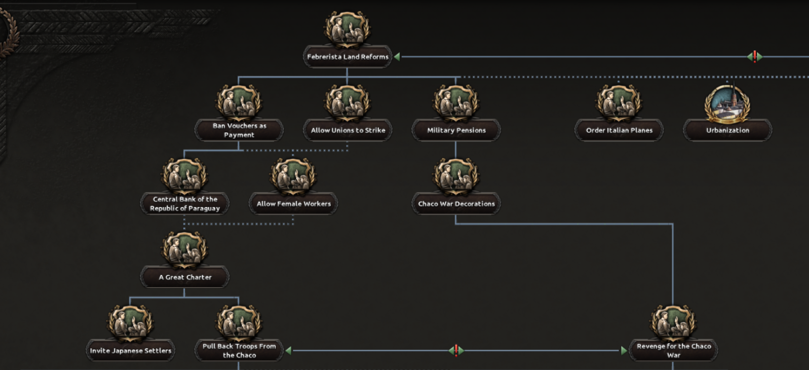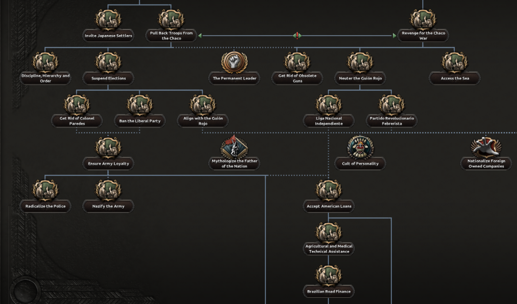 This focus path will pivot the country from the Franco left leaning military dictatorship towards a more fascist and authoritarian military dictatorship under Morínigo.