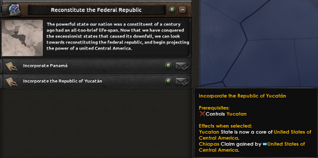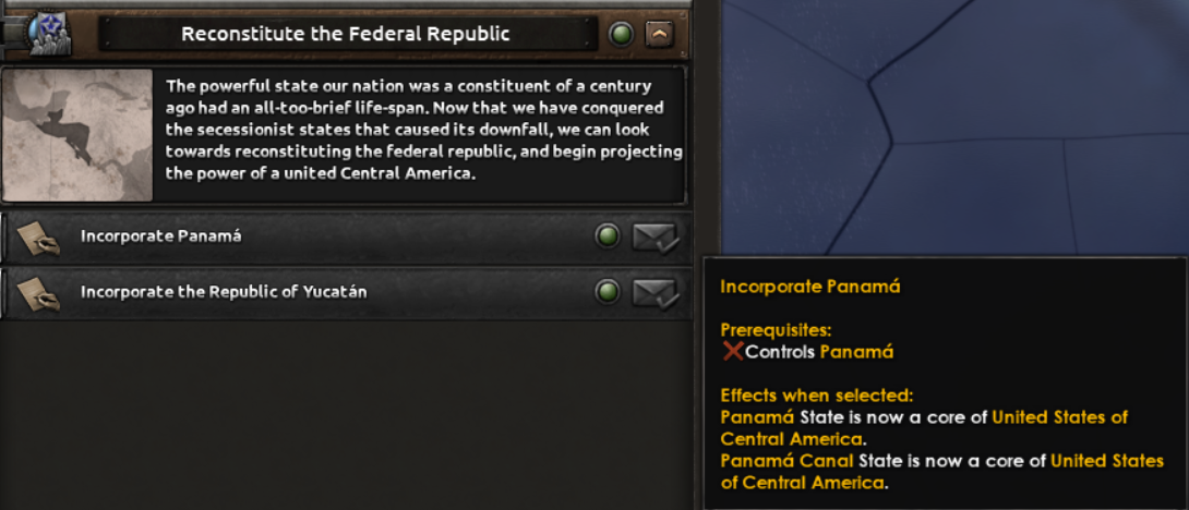 The old formable nation of Central America now has two possible follow-up decisions that can give them a small bit of extra core states.First up is Integrating Panama.