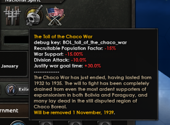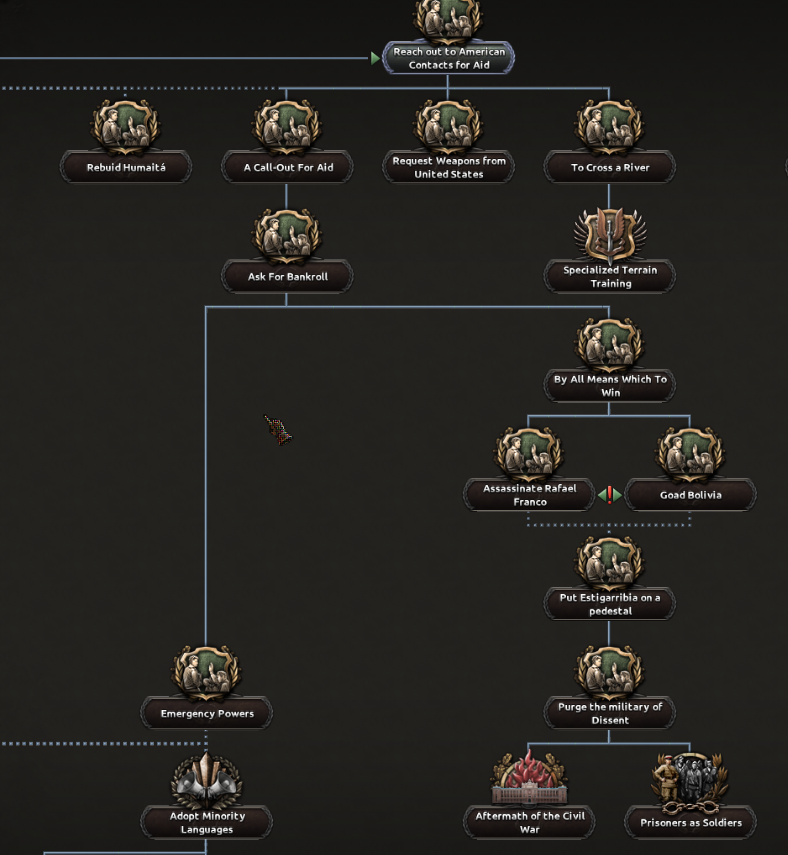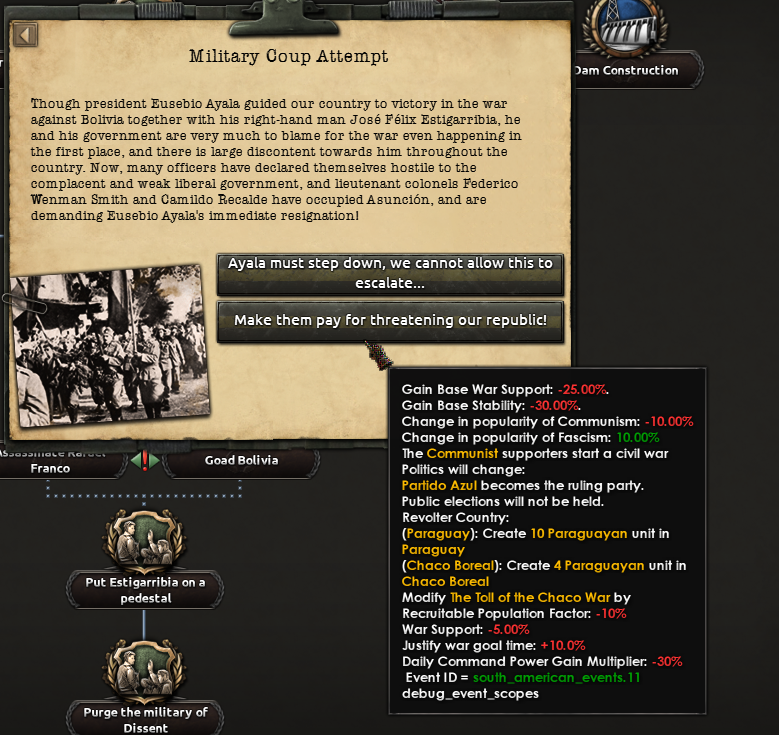 In Feb 1936 Rafael Franco will launch his coup against the government where you can pick to either let him seize control of the country or resist him. Allowing him to take power will lead you down the historical path, and resisting him will plunge you into a civil war.
