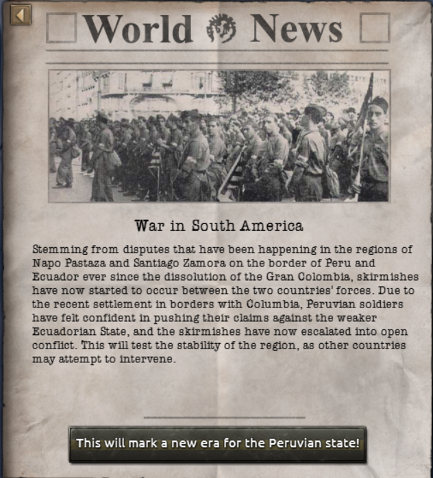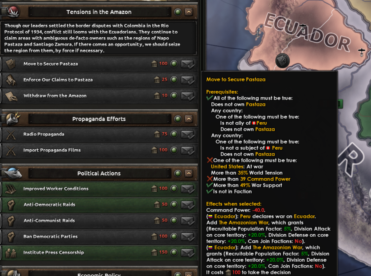 First up in terms of what I have contributed to this bag of treats is the Peruvian-Ecuadorian war of 1941. Now, Ecuador starts with ownership and a core on Pastaza, and Peru will have to take it through war, with the option of a scripted peace if they manage to take it. Ecuador can however also secure themselves a scripted peace from this ordeal, as long as they take Loreto, which means a skilled Ecuador player can even gain territory from the conflict.