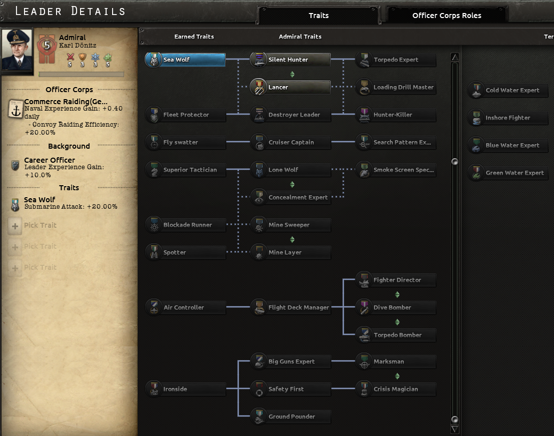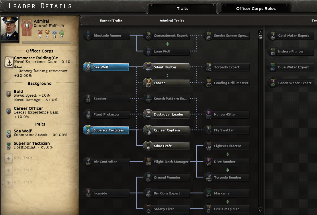 , and I have recently joined the Hearts of Iron IV team. As some of you may know, I have a bit of a thing for naval warfare in HOI, and have wanted to retouch the Admiral Trait tree for a while now.Here’s the old version:
