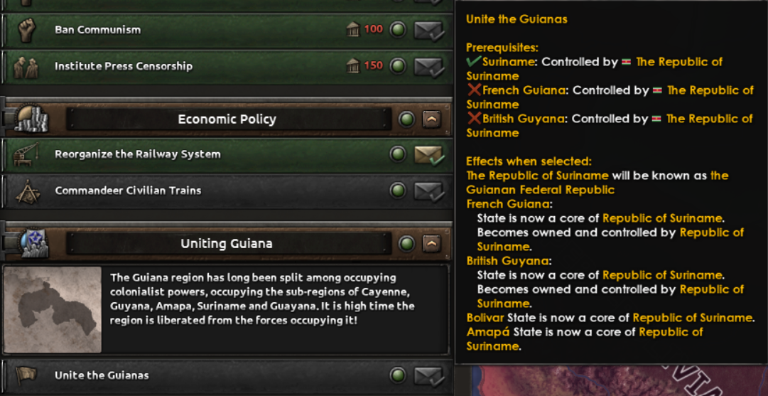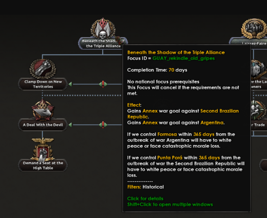 Uruguay has access to this as well but they target Rio Grande do Sul and Región Mesopotámica. Later you can decide whether you want to go on a crusade against imperialism, forgoing any factions but having the ability to core more land, or a more conservative approach where you can core some land but you can still join factions.