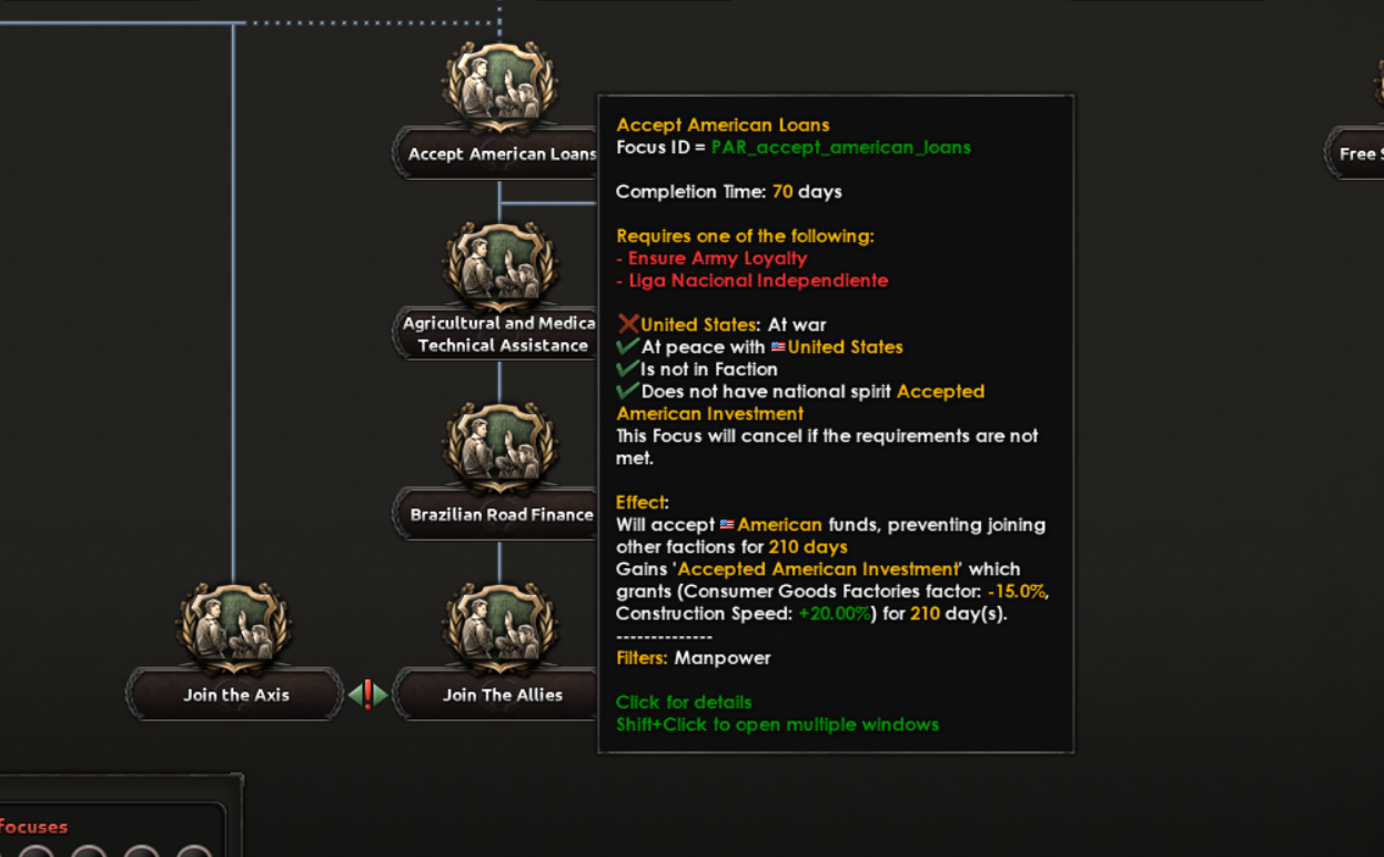 In game this is modelled by accepting American investment, whereby you won’t be able to join the Axis for the duration of the investment. Going down all the investment paths will keep you out of the Axis powers, but grant you massive boosts to the economy. How far you exploit this is up to you.