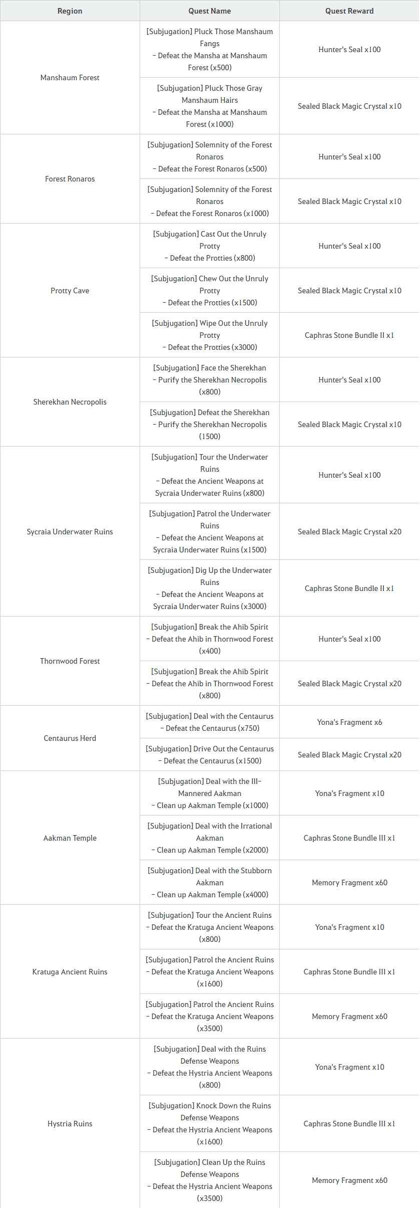 - The following region quests will be automatically accepted upon entering the specific monster zone with a character from Lv. 61. (Once per Family)