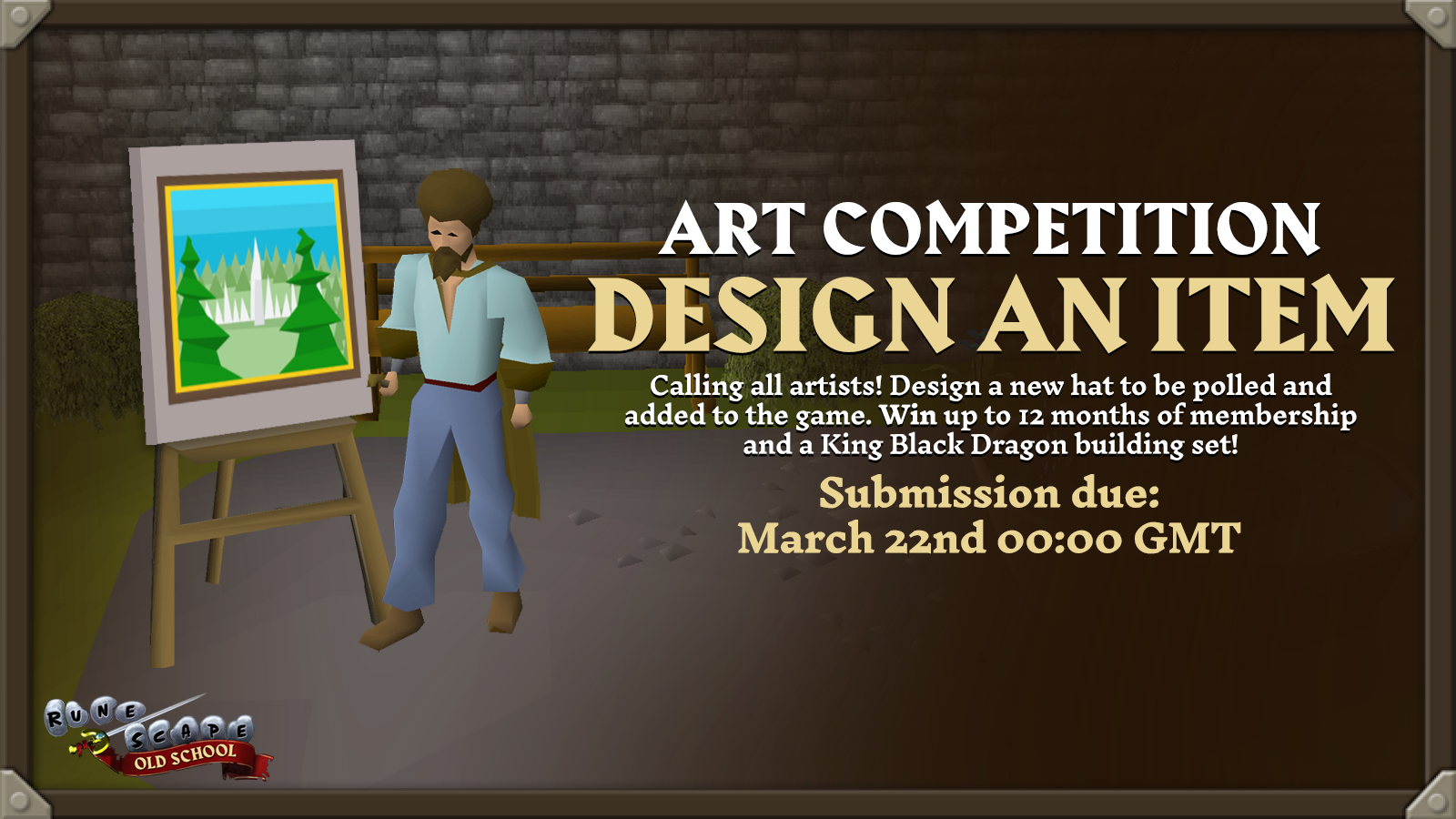 - Submit your artwork to any relevant social media platform (Facebook, Twitter, Instagram, Reddit or the Official OSRS Discord) or by submitting your entry to oldschoolcommunity@jagex.com with the subject line Art Competition - Design A Hat.