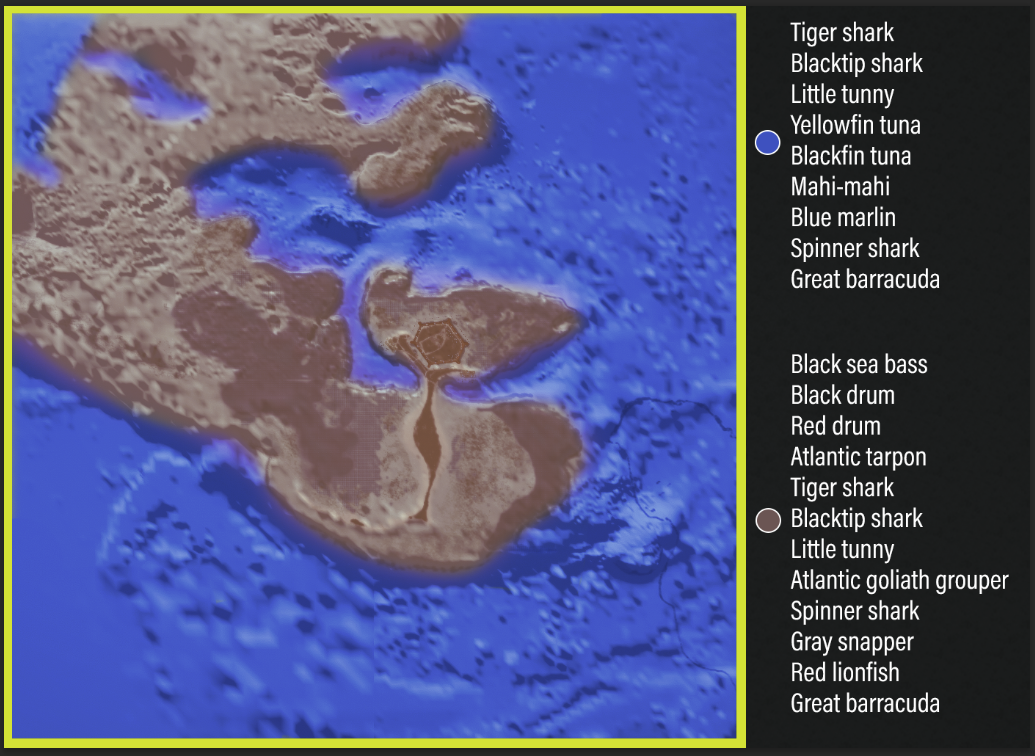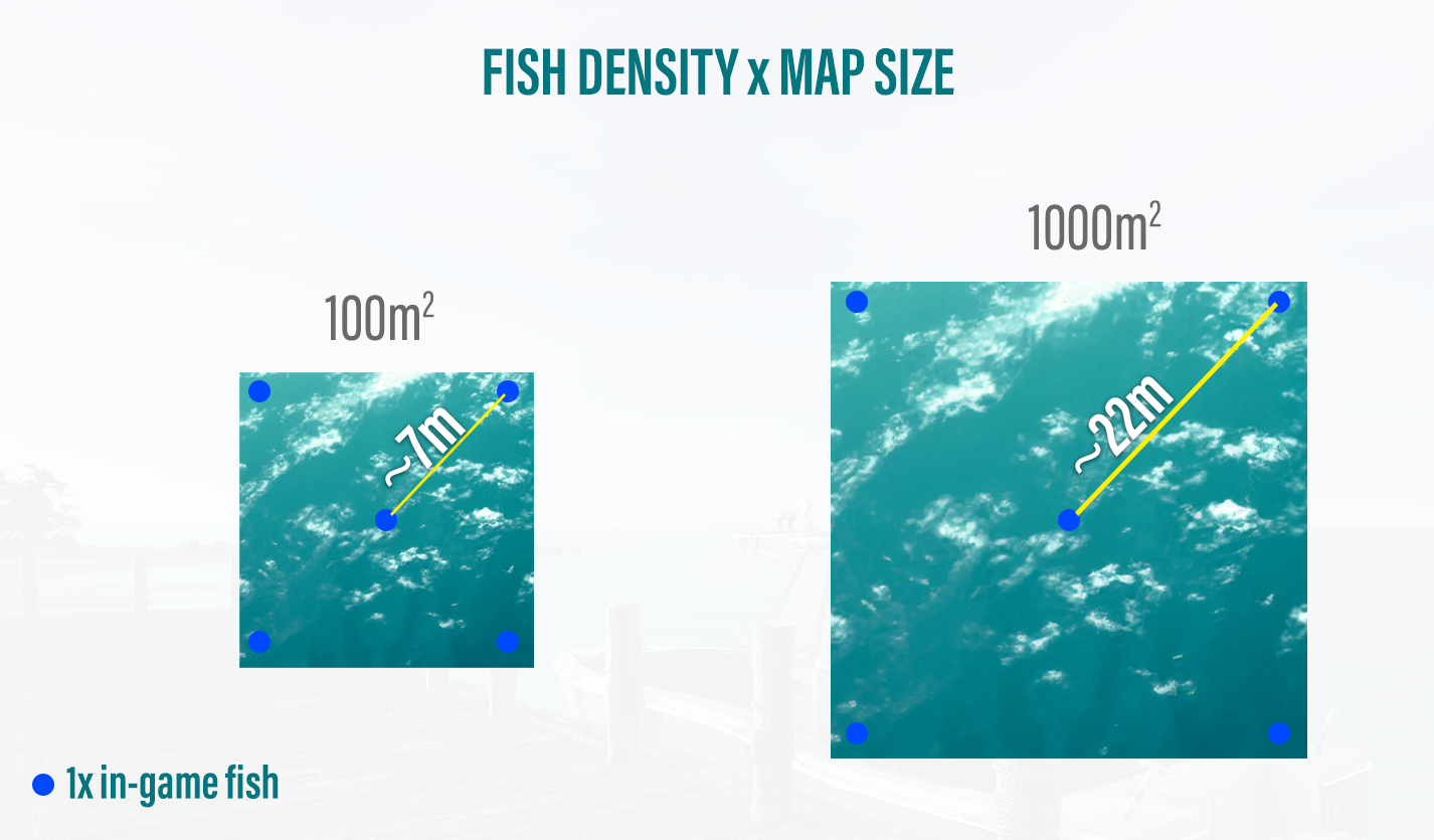 The reason why Florida feels so empty is simple - the map is huge. I mean, literally, it's the biggest map in the game - over 50x bigger than Betty Lake. So if we would put the same amount of fish on Florida that is on Betty Lake or any other map, even Pinas Bay Ocean - it would feel EMPTY. Here is a small comparison.