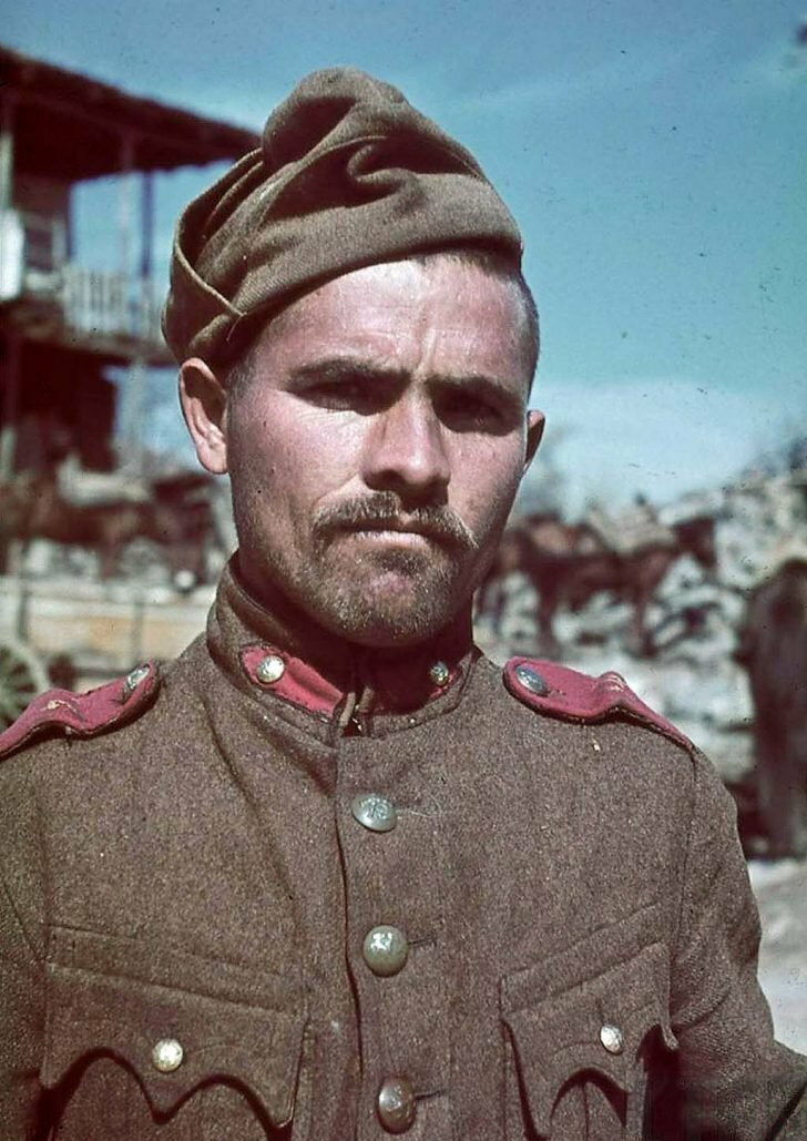 The Bulgarian soldier is predominantly wearing brown jackets and pants, with red collars and shoulder insignia for the infantry. The Bulgarian M36 helmet is very reminiscent of the ubiquitous German