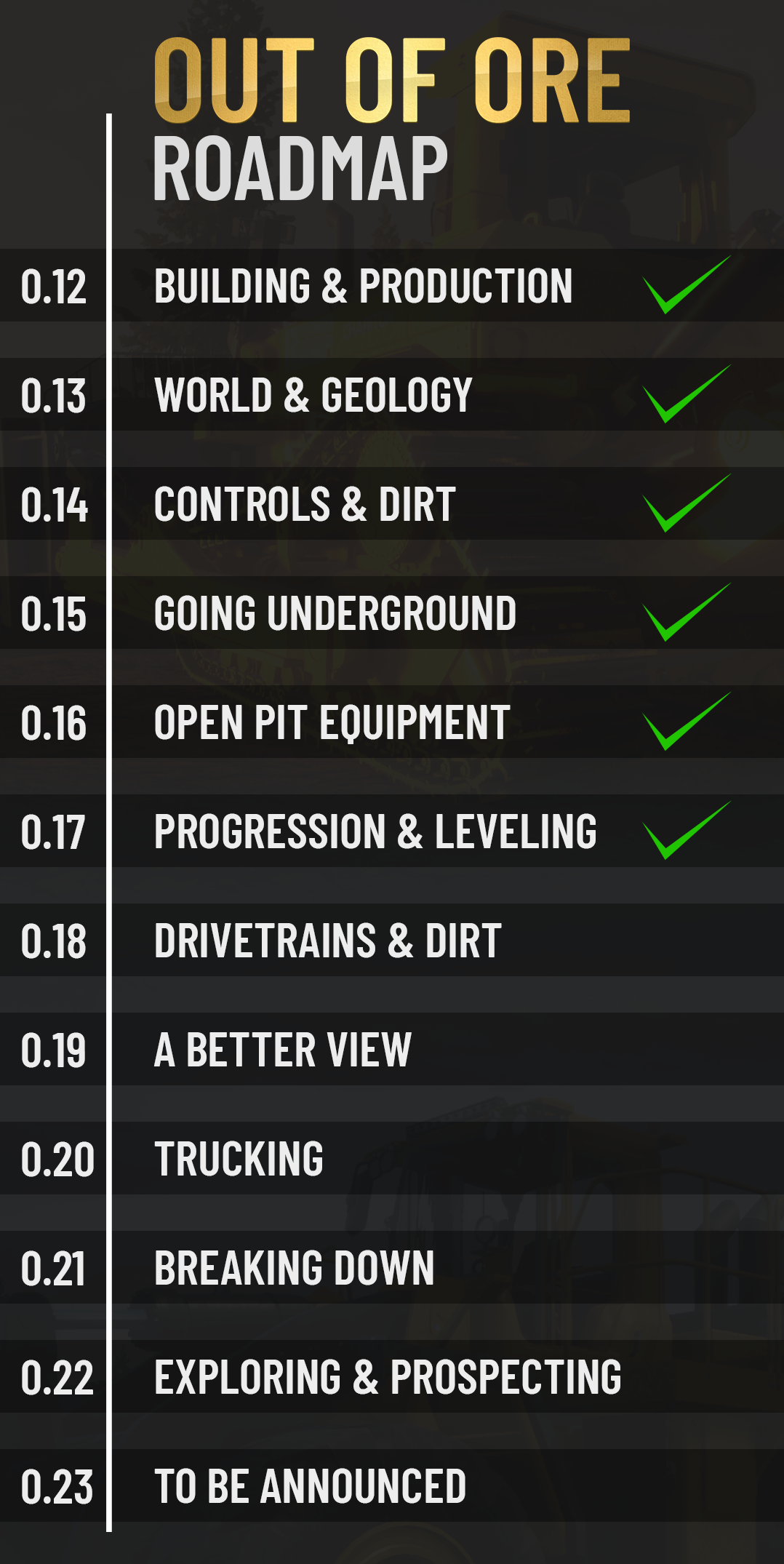 This is a double update 0.16 "Open Pit Equipment" and the 0.17 "Leveling & Progression" update