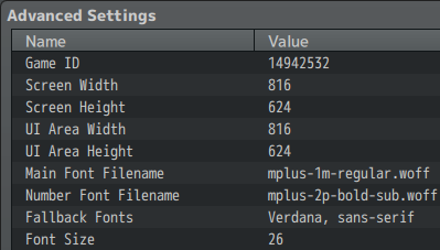 Easily set your resolution to the desired size, then adjust the UI for the perfect fit. Additionally, the advanced settings also define the fonts for your game, and set what fonts to fallback on if they are missing!