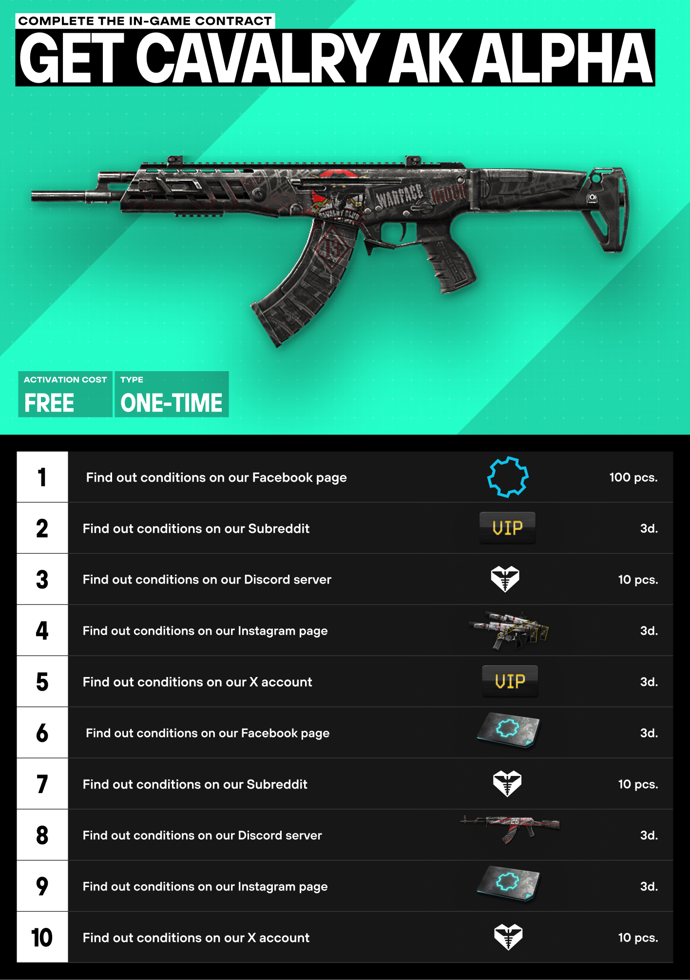 If you like to challenge yourself and fancy a scavenger hunt every now and again, then this contract is perfect for you! Join the Winter Challenge and take up this very special contract to get cool rewards and earn yourself a permanent Cavalry AK Alpha. Whatโs the catch? Well, you wonโt find the stage tasks in the game, and instead youโll have to locate them scattered across our various social platforms.How will this work?