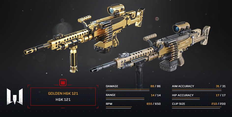 The H&K 121 has expanded the Rifleman machine gun lineup. Its toughest competitor is the Stoner LMG A1 to which the new weapon compares favourably thanks to an increased rate of fire, better accuracy, a larger magazine, and a higher damage multiplier in the arms. These advantages are offset by a slightly lower damage, moderate range and ammo. Learn more.