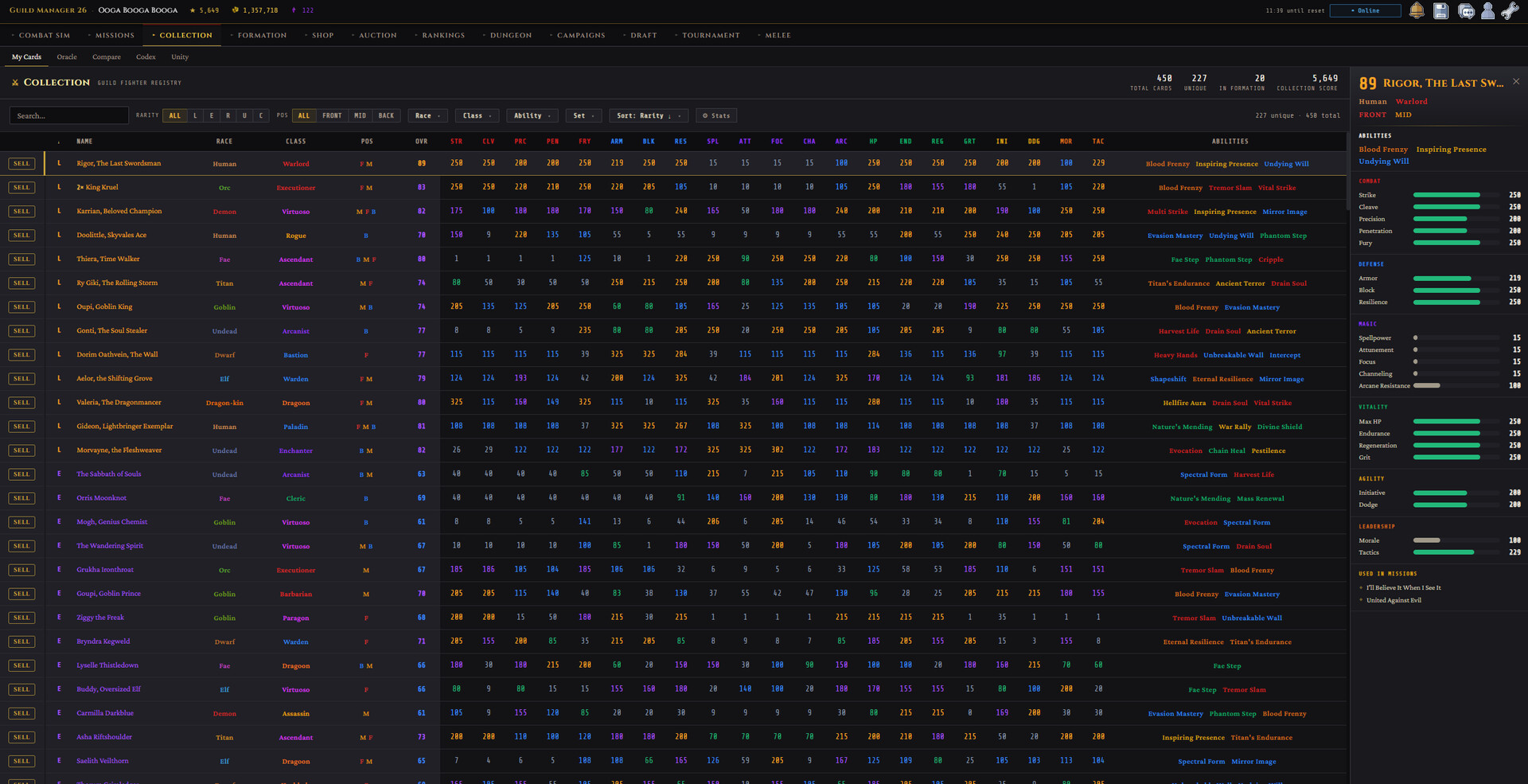 Build Your Guild. Command the Battle.Guild Manager 26 is a dark fantasy hero collector and auto-battler. Recruit fighters, forge formations, and command fully simulated 20v20 battles where every stat, ability, and position matters.Discover 1,300+ unique fighters across 10 races and 5 rarities. Open packs, trade on the Auction House, complete missions, and sacrifice the weak in the Sacrificial Pit. Every card has a race, archetype, unique abilities, and 22 stats — no two play the same.Place 20 fighters across front, mid, and back lines. Stack races and archetypes to unlock 92 Unity Buffs that transform your entire guild. Every position, every pairing, every stat matters.Every battle simulates fighter-by-fighter — damage, healing, crits, abilities, and positioning all play out in full. Review detailed scoreboards to see who carried and who fell.Enter 32-team Tournaments, draft fighters in Gauntlet runs, grind through Melee League seasons, and climb the Ranked Divisions. Buy and sell fighters on the player-driven Auction House. Take on 50-floor Daily Dungeons with Hard Mode, or fight through three full Campaigns with boss fights, rest stops, and charm selection along the way.