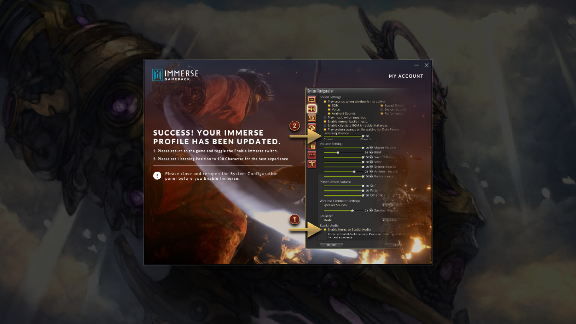 A new dimension of sound awaits.Embody and Square Enix have joined forces to bring 360 personalized spatial audio to the world of FFXIV. Venture through Eorzea and beyond as though for the first time and experience a level of audio immersion unlike anything you've heard before. Fully Integrated Personalized 360 Spatial AudioImmerse Gamepack brings Embody's revolutionary personalized HRTF technology directly into FFXIV at the Object Level. Every single sound effect in the game, from boss mechanics to player SFX, will be rendered with unprecedented depth and positional accuracy in full 360 degrees - including above and behind you. Designed in Collaboration with Square EnixImmerse Gamepack is an official add-on for FFXIV, and was developed in close collaboration with the incredible FFXIV sound team to deliver an unmatched immersive listening experience to FFXIV players everywhere. Compatible with All HeadsetsThe new 360 spatial audio experience of FFXIV outputs as binaural stereo, allowing it to work with any headset. SetupStart by downloading the Immerse Gamepack from the Steam Launcher. Then, enter your email address. Scan the QR code with your phone and follow the instructions to create your personalized HRTF based off your head and ears. Customize your spatial audio experience by selecting Headphone EQ and Preset EQ. Once completed, launch FFXIV and head to the bottom of your sound settings to turn on Immerse Spatial Audio.© SQUARE ENIX